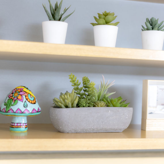ブルーグレーのアクセントクロスに、壁上棚のグリーンが映えます。